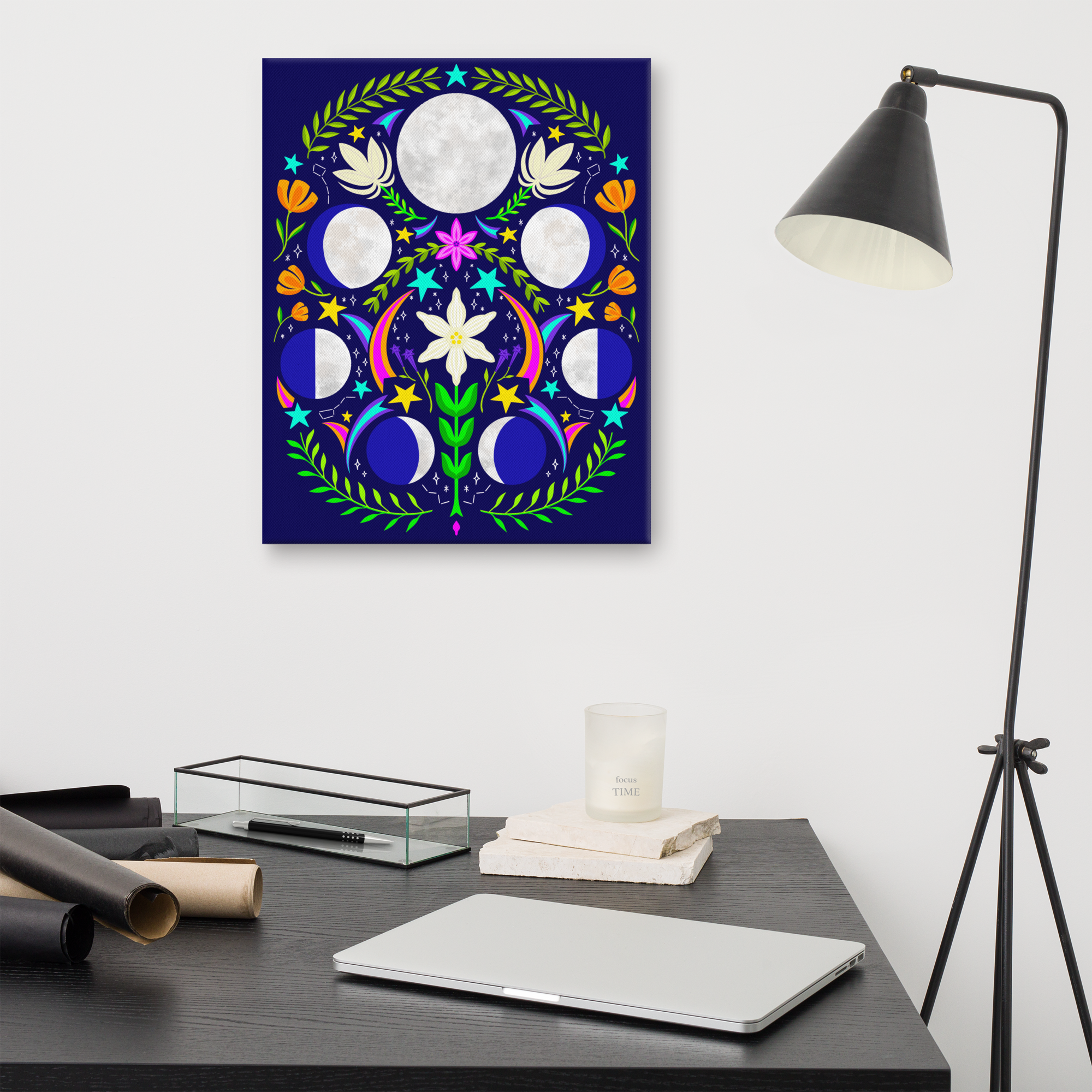 The Celestial Phases: Folk Art Style Lunar Phase Canvas Art Print features a beautiful folk art inspired design of the lunar phases among bright and boldly-colored botanical elements and shooting stars set upon an inky dark blue background. The attention to detail in this intricate hand-drawn illustration is truly out of this world, making this canvas art print a special addition to your living or working space.