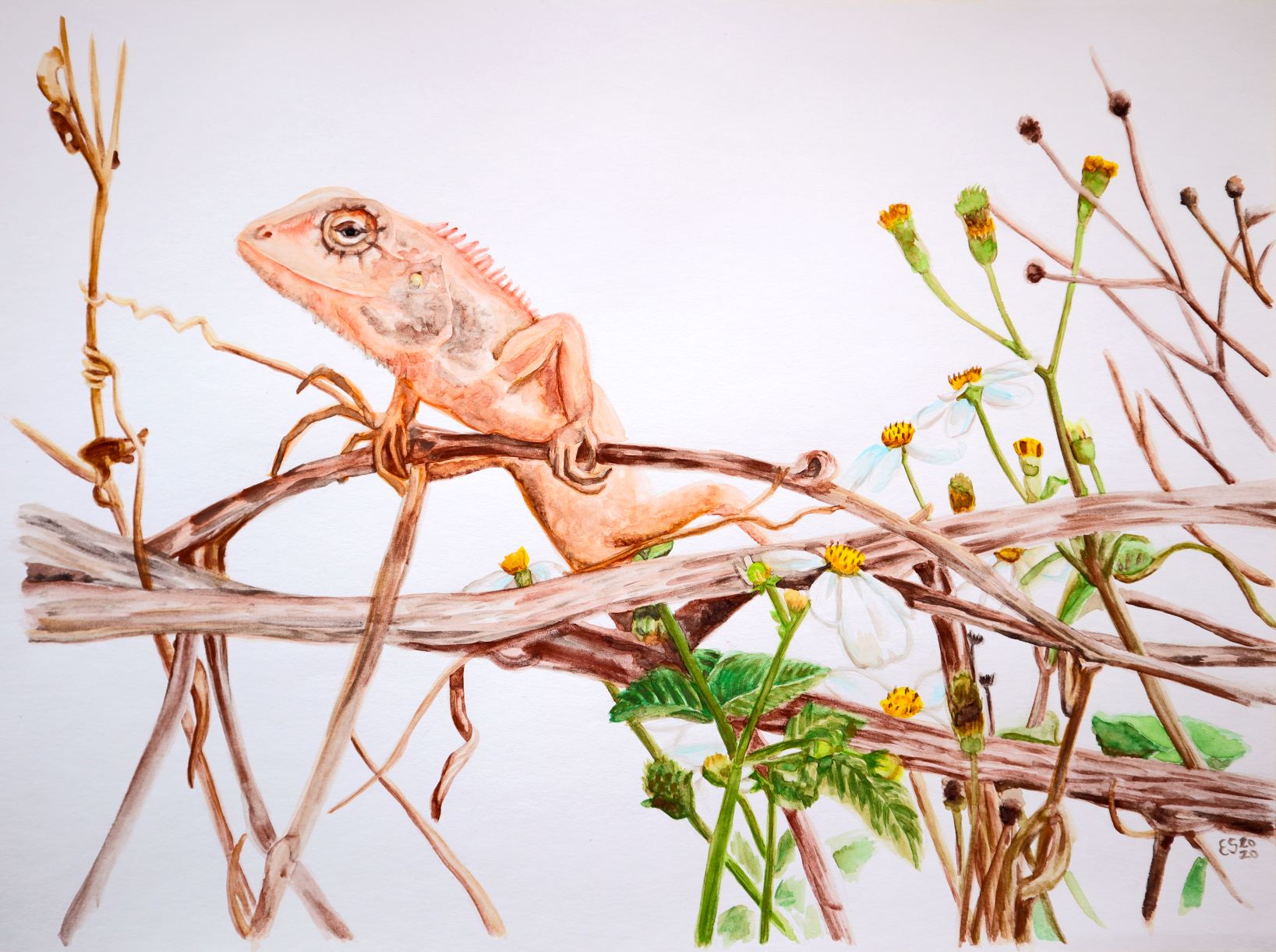 I spied this smug-looking red garden lizard perched on a fence during a walk to the Red River in Hanoi, Vietnam. Along the banks of the river are slices of countryside with active farms and several gardens. You too can enjoy the smug satisfaction of the red garden lizard in this fine art print of a watercolour painting I made in 2020, inspired by travels in Vietnam.