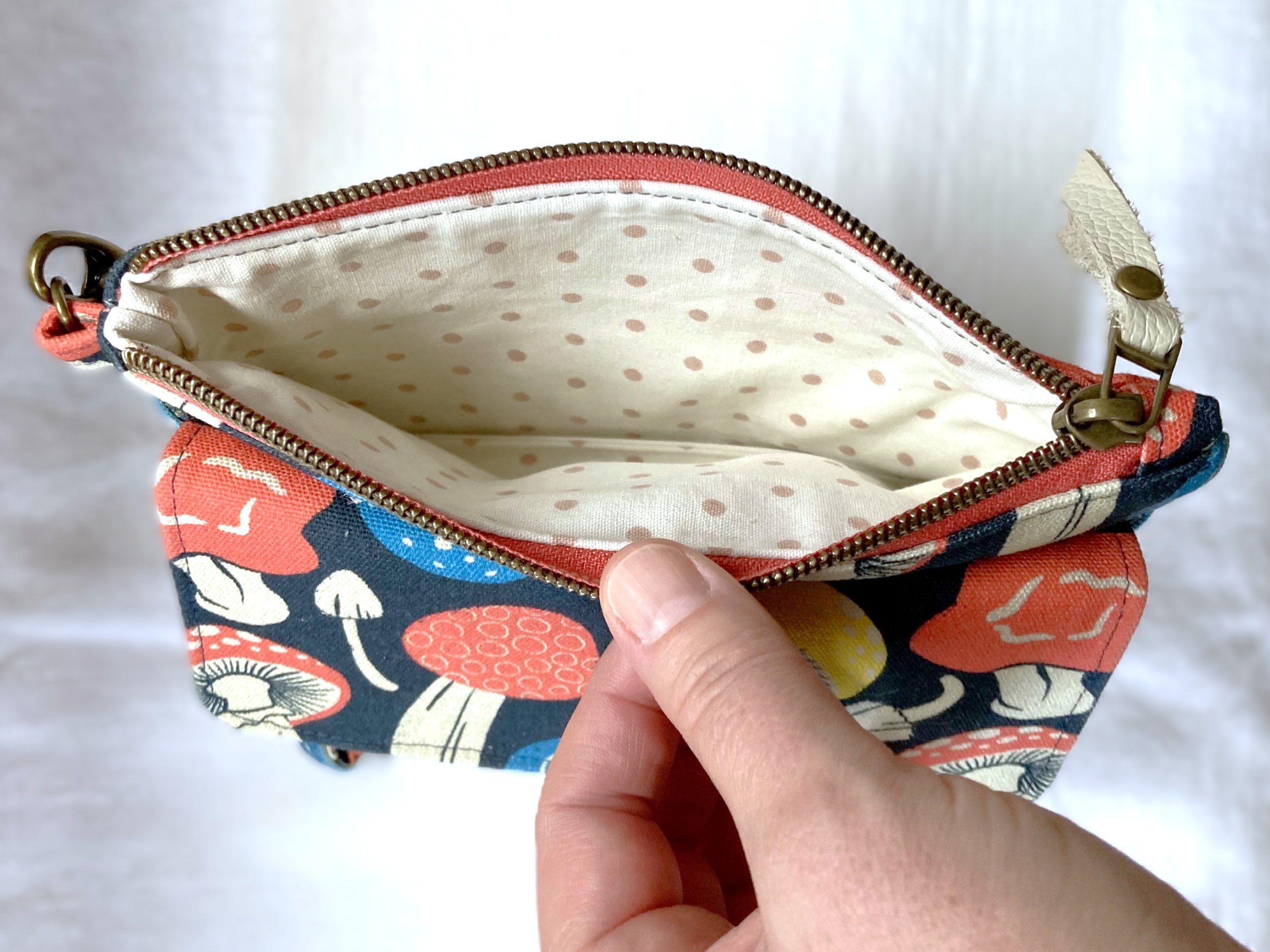Phone wallet in three colour versions with artist-designed retro mushroom print on cotton canvas.