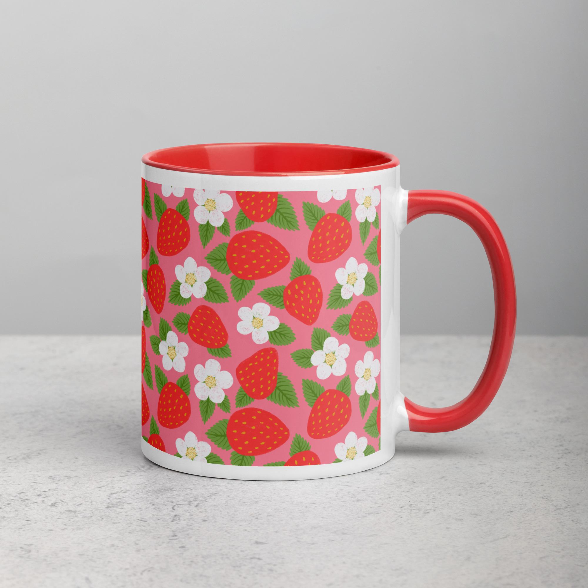 Delight in the sweet bliss of each sip with your new favorite mug: Sweet Strawberry Garden Mug with Color Inside. You are now inside an enchanting strawberry garden with white blossoms, lush green leaves, and vibrant, juicy red strawberries.