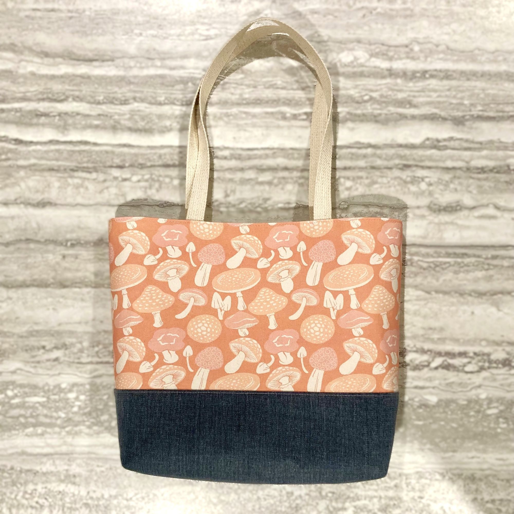 Tote bag in two sizes with artist-designed retro mushroom print on cotton canvas or cat moods print on velveteen paired with denim contrasting fabric. Features sturdy cotton handles and inner lining. This structured and roomy tote bag works perfectly as a cute commuter or book bag (regular size) or shopping bag (larger size).