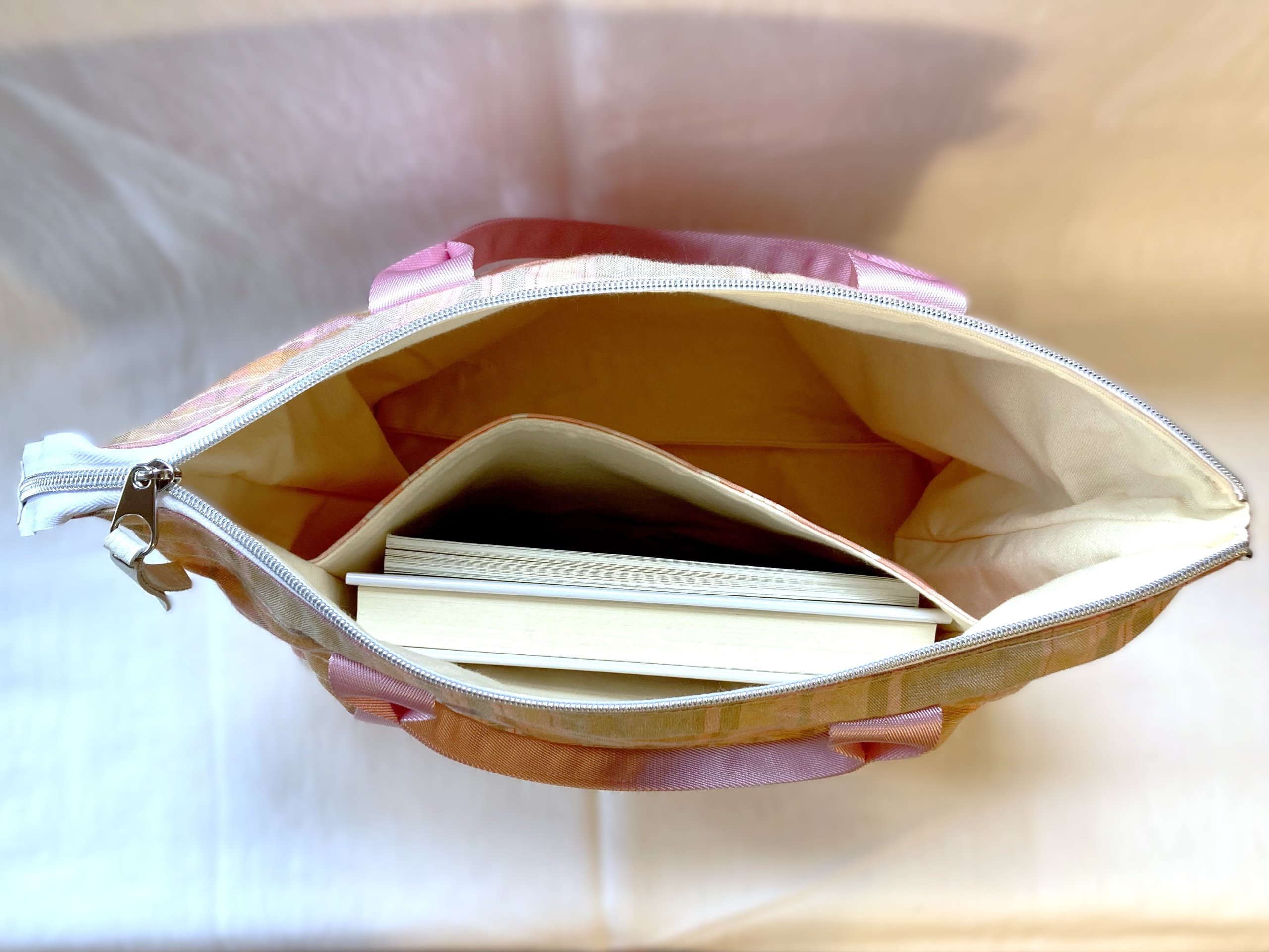 Features internal slip pocket, sturdy lining, and adjustable strap. This roomy zipped tote bag with silver metal-look nylon coil zipper, chrome pull and strap hardware works perfectly as a cute commuter or project bag (small size) or overnight tote bag (larger size). Larger bag features trolley sleeve with zipper (works as extra pocket when not in use as trolley sleeve).