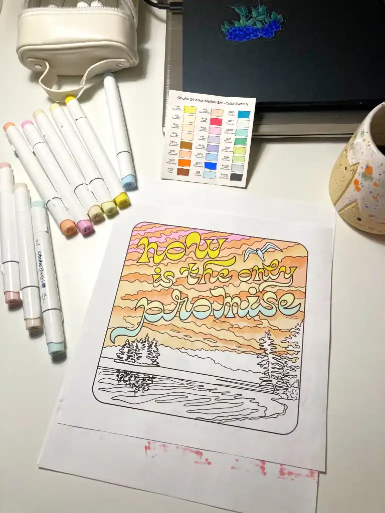 When it came time to testing the colouring pages, Ohuhu alcohol markers provided beautiful colour blends and the sensitivity of painting when using the brush tip ends. I really enjoyed testing the book with these markers. But keeping a bleed sheet underneath the page is crucial to keeping the next colouring page clean. Ohuhu does make a water-based odourless, no bleed marker, but I haven’t tested them yet. If you want to try them yourself, you can order them here.